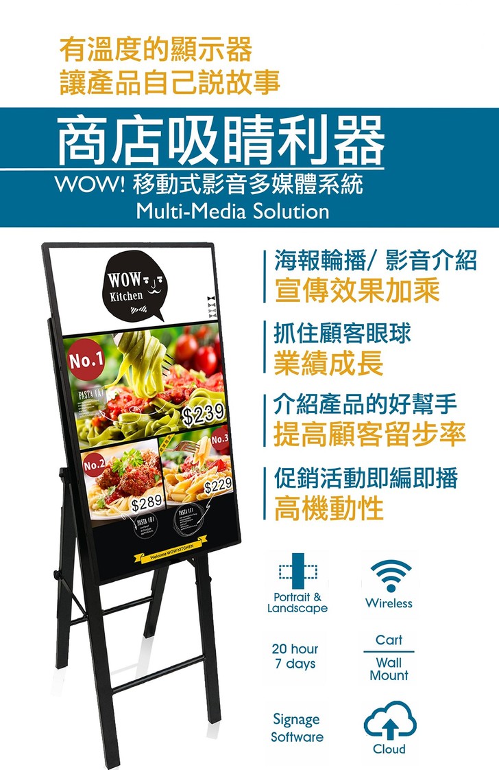 WOW!多媒體廣告機採用Android系統,內附海報樣本,針對各形各色的餐廳、服飾業、零售業和文創活動設計了眾多豐富的風格樣板供業者挑選,業者可簡單將商品圖片和影片匯入,快速製作海報,或是自己編輯樣板,海報最多可同時呈現2~10個分割畫面,影片畫質最高可達Full HD 1080p。使用WOW!一體式多媒體廣告機,簡單外接RockTek的i24飛鼠鍵盤或i8+觸控鍵盤,即可讓零售人員輕鬆編輯電子看板所要呈現的樣板風格、圖片、影片、文字和字型、跑馬燈訊息,並在製作完海報後,管理各海報的時間排程,讓海報自動在指定時間內輪播。美觀和友善的操作介面,讓使用者可以快速上手,馬上編輯,馬上播出,增加宣傳效果,提高顧客留步率。