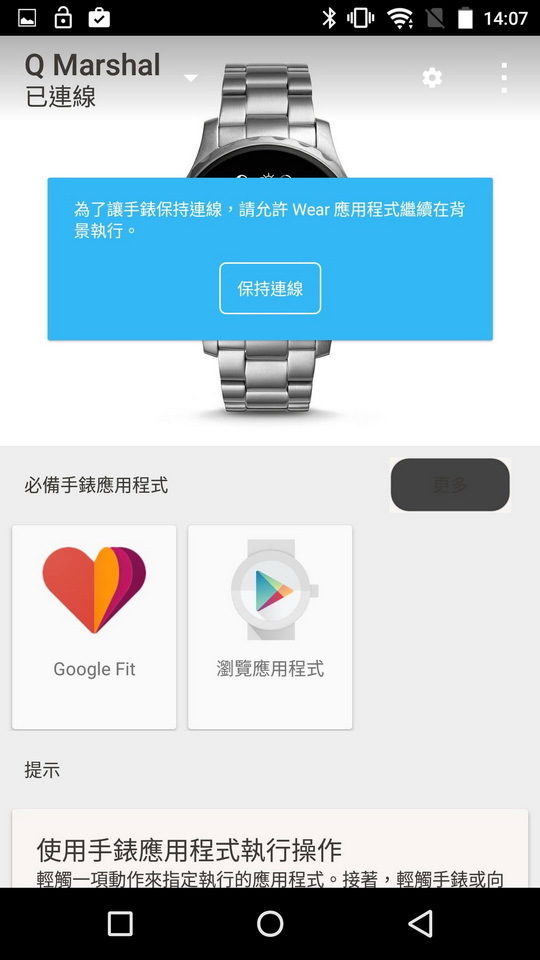 ▼ Android Wear應用程式 很簡單,打開就會提示可以另外下載的應用程式,甚至可直接設定及啟用一些功能。