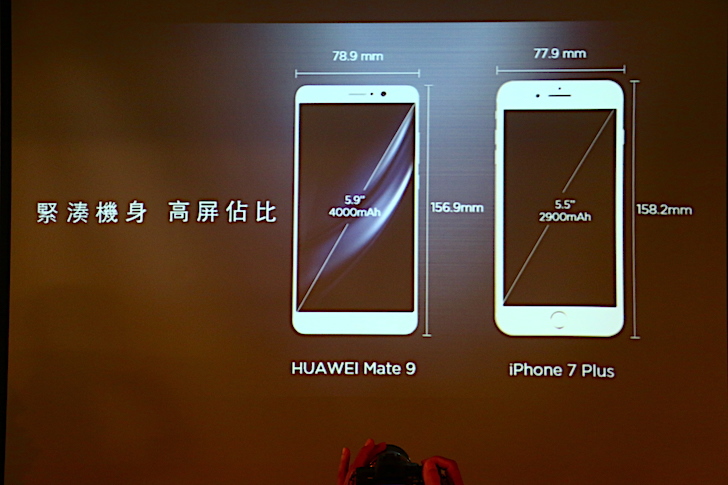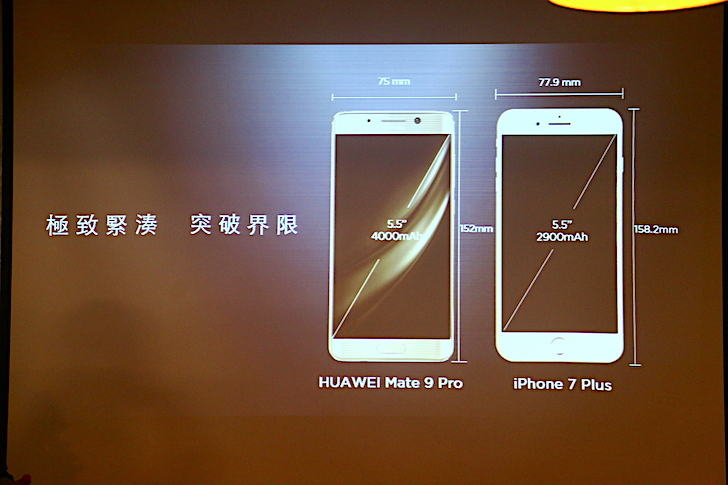 有趣的是,華為 Mate 9 Pro 屏佔比表現相當出色,所以與同樣採用 5.5 吋的 iPhone 7 Plus 相比,大小反而更小更緊實。此外,華為 Mate 9 Pro 內建 4000mAh 大容量電池,與 iPhone 7 Plus 的 2900mAh 相比,大了不少。