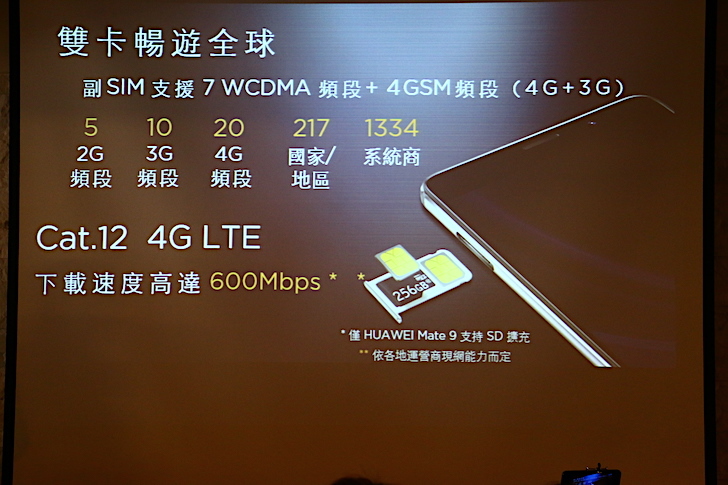 而華為 Mate 9 還具有一項 Mate 9 Pro 也沒有的特色功能,就是支援三選二卡槽設計。為了讓使用者更有彈性,華為 Mate 9 採用三選二卡槽設計,當使用者沒有雙卡雙待需求時,第二卡槽可以放置記憶卡,最高支援 256GB 擴充。相反的,若使用者有雙卡雙待的使用需求,第二卡槽可以放置 SIM 卡,並支援 4G+3G 頻段。此外,華為 Mate 9 還支援 Cat.12 4G LTE,提供 600 Mbps 的下載速度,無論是下載大型手遊,還是下載高畫質影片,都可以體會到最快的下載速度。