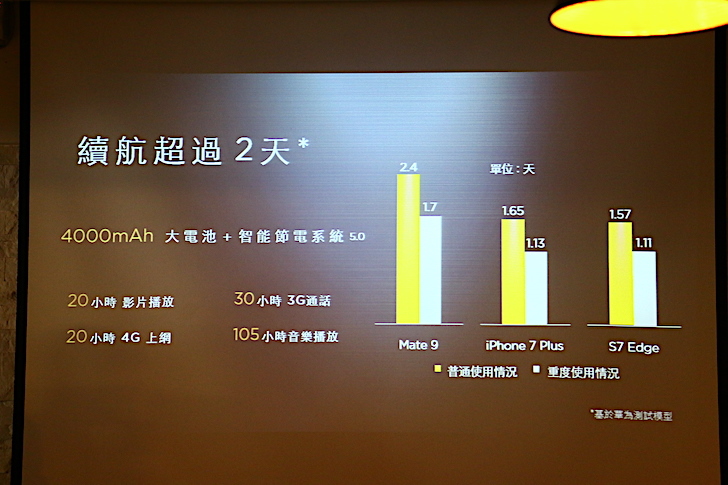 除了硬體規格、上網速度相當驚人之外,續航表現也是華為 Mate 9 的強項之一。華為 Mate 9 與 Mate 9 Pro 一樣,都內建 4000mAh 容量電池。經官方數據表示,華為 Mate 9 在普通的使用環境之下,可使用時間長達兩天之久。對於常常在外做生意、跑業務的朋友,甚至是學生族群來說,都是相當充足的續航表現。
