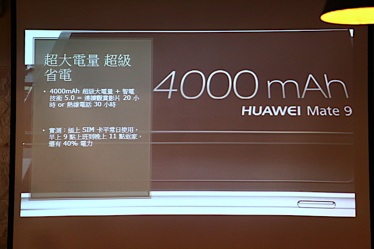 而點子生活的 Kisplay 大大也分享了實際使用華為 Mate 9 之後的續航力表現。正常使用的情況下,上午九點上班至晚上十一點睡前檢視手機時,電量還會剩下 40% 左右,可見麒麟 960 與 4000mAh 大容量電池之間的省電效果相當出色。