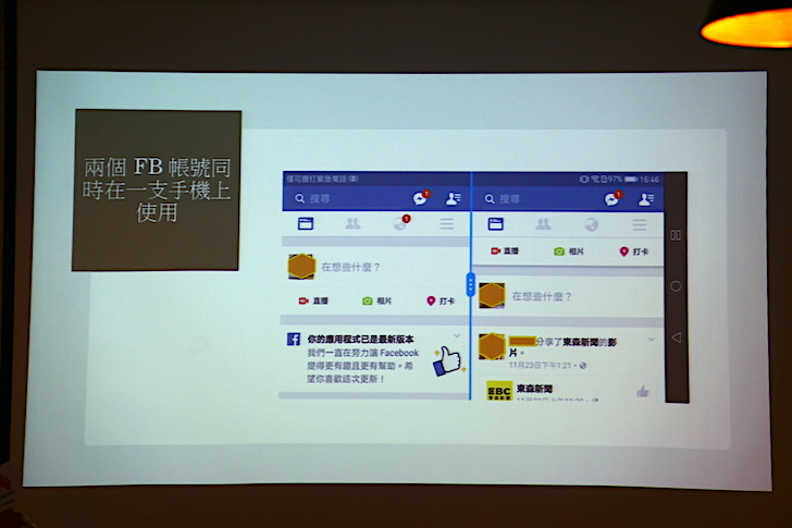 此外,EMUI 5.0 還支援應用程式雙開功能,讓使用者可以同時登入兩個 Facebook 帳號,公私分明。