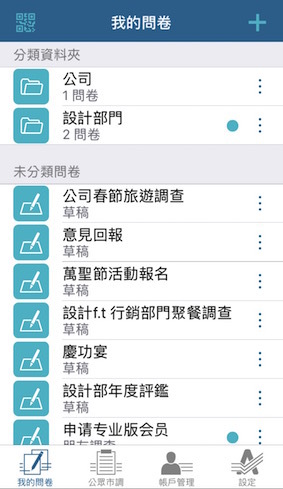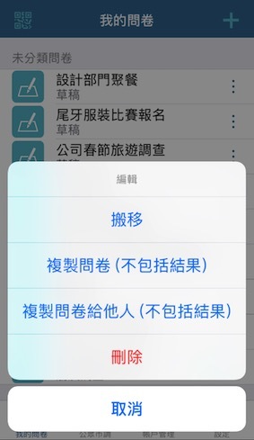 像我們部門因為常常趕設計圖、開會有的沒的,幾乎都會一起訂午餐、下午茶之類的,一開始我都傻傻的一份一份問卷做,後來我發現問卷可以直接複製!反正統計吃什麼的內容都大同小異,這樣超省時間!還不錯的是它有資料夾可以分類,不然問卷那麼多都要暈了