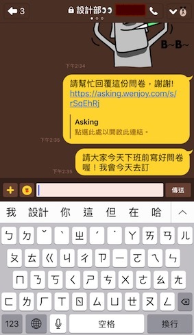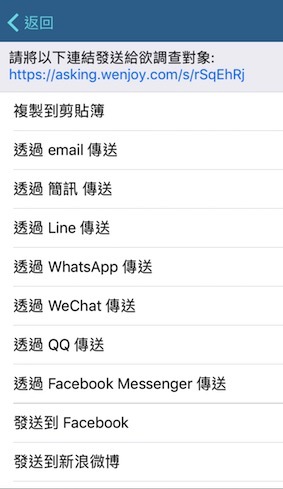而且它和很多社群都有整合,例如 Line、Facebook、email 這些,像我們自己部門在Line有設一個社團,我就會把問卷直接傳到社團,比較方便,每次只要是問有關吃什麼的問題,大家都回超快的