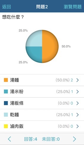 果然高科技就是不一樣,用App的話最後就直接看統計圖就好了,超方便的!而且我超討厭有些人明明點什麼還會忘記,所以我在一開始調查的時候就有放身份輸入題,要大家把名字填上,我就可以按選項進去看有誰選,這樣才不會亂掉