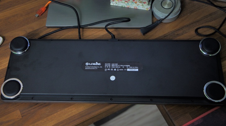 背面,不像一般的鍵盤是一小片止滑腳墊,而是超大的四個大腳墊(差點打成大平台XD)