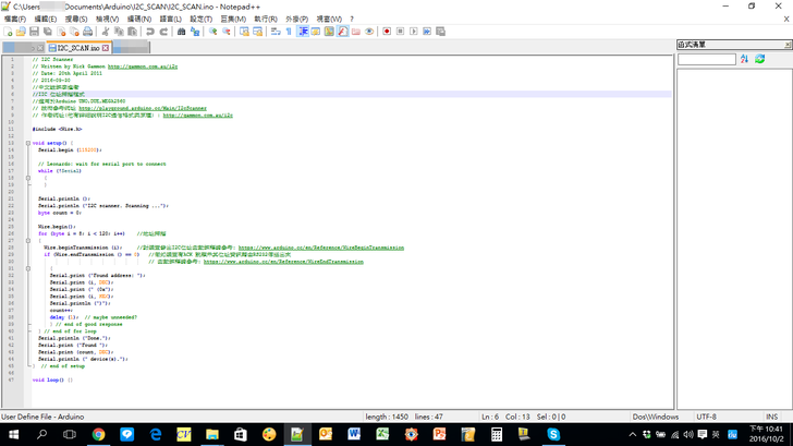 我們常常到購物網買一些Arduino的sensor。。。由於Sensor 百花齊放,做的人沒有提供資料,賣的人也不清楚,技術資料轉來轉去,大家一片混亂,拿I2C界面LCD來講,明明範例的位置是0x27,但是我們照着寫就是動不了,差半天才知道LCD模組的位置不同,現在我就提供大家一個方法I2C address Scan 程式有了它就不用再傷腦了。