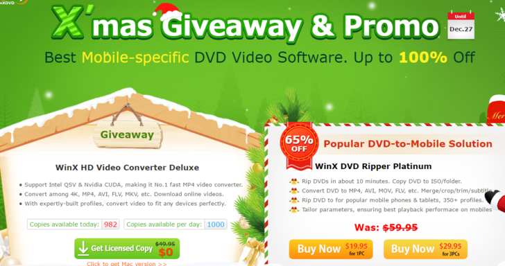[情報] 「WinX HD Video Converter Deluxe」聖誕限免!影音下載、格式轉碼一鍵搞定! 科技 · 麥克tsai · 發表於 2016-12-23 16:25 · · 檢舉 列印版 twitter plurk 4.8千閱讀次數 WinX HD Video Converter Deluxe支援下載YouTube等線上影片,同時能夠將你電腦中的影片轉檔為各種常用的影片格式,或把影片轉為iOS Android機可播放的格式,AVI, MP4, WMV, FLV, 4K, MP3, MOV, MPEG都可以轉檔。Digiarty為歡慶聖誕,目前將原價值50美元的影音轉檔軟體免費送出,不過每日限量1000份,有需要的趕緊收下吧~~ 限免位置 讚 收藏 快速回應 引言回應 登入來回應 header home