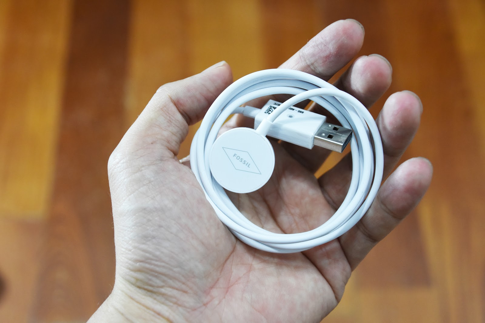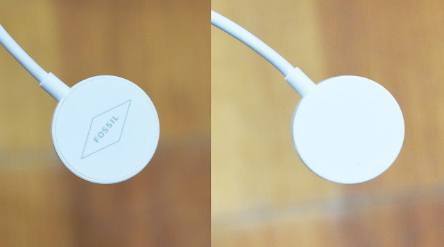 ▼ 無線磁吸式的圓形吸盤的正反面,可以看到吸附手錶那一面有著大大的 Fossil 標誌。