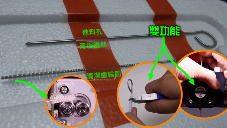 【▼】進料孔清潔鐵絲有雙功能,第一個功能就是單純的進料孔清潔用,使用方式是由噴頭上方往下方清,並擠出廢料材;第二個功能是線材進料管裁切,可避免進料管變形。至於清潔齒輪刷,顧名思義就是清潔進料齒輪,建議三個月清潔一次。