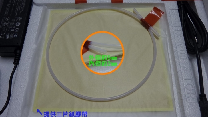 【▼】進料管整個長度大約60cm,內徑約2mm讓1.75mm的PLA線材進料順暢,外徑則為5mm左右,而列印過程中多多少少都會耗損,建議全長低於50cm時就請更換新的進料管,可避免線材送料應力不均而遭折斷。另外da Vinci Mini也提供三大片符合列印平台的平台貼布,黏性夠且可重複利用,真的有夠環保。
