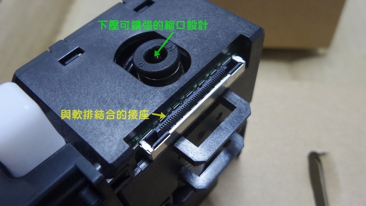 【▼】da Vinci Mini噴頭上方部分,有與軟排結合的接座,也有下壓就可擴張的縮口設計,可固定前端進料管的部分。