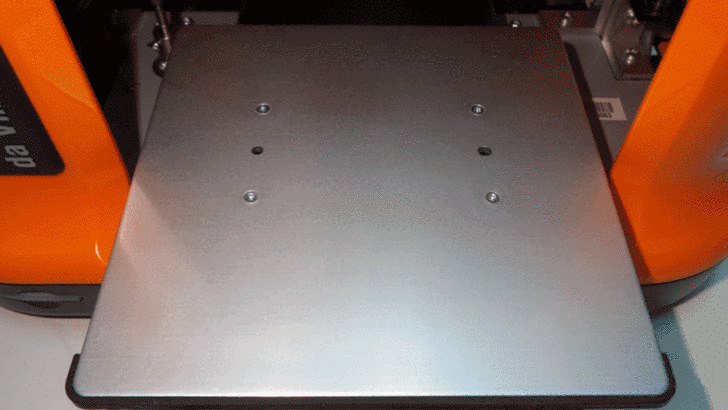 【▼】da Vinci Mini的列印平台感覺是鋁材質,表面有幾個維修用的螺絲孔,當貼上平台貼布後就看不見了;而下方黑色塑膠空間有設定兩個滑軌,讓列印平台能夠前後移動。