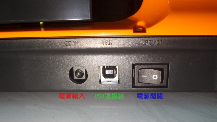 【▼】在da Vinci Mini 3D列印機背後的實體介面,依左至右為電源變壓器輸入、USB傳輸連接線與電源開關。