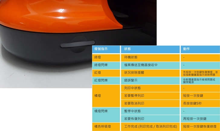 【▼】最後送入一個3D列印檔(STL格式)進行列印,列印時狀態指示燈會顯示橘色燈號。