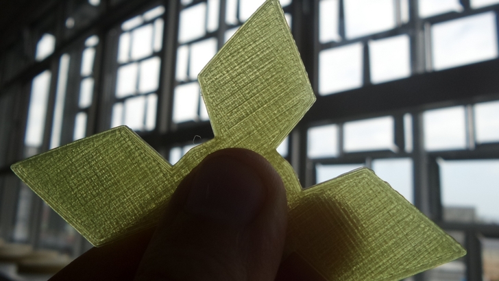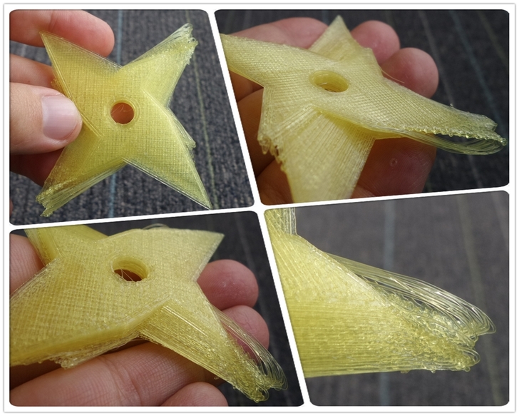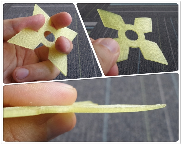 【▼】另一款手裡劍,有別於前一款完全平面的設計,這款手裡劍有漸層的設計,列印數據為標準外殼、堅硬的3D密度、0.1cm的列印厚度,可能是太薄的關係,所以手裡劍的刀尖部分有些潰堤,建議列印厚度選擇至少都要0.2cm以上較為保險。