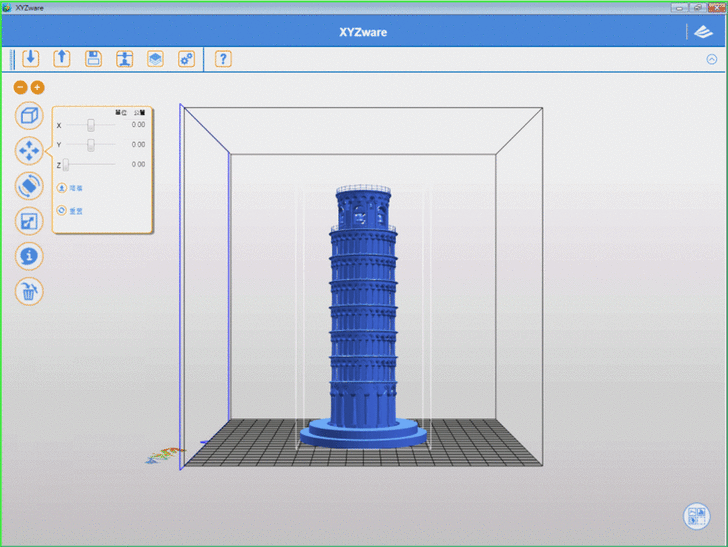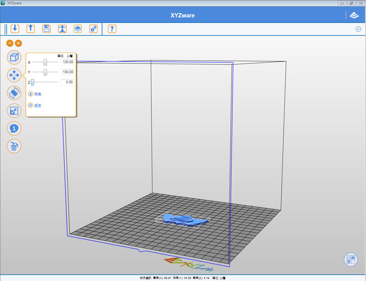 【▼】XYZware針對模型可移動不同的位置,灰色網格就是實際的列印平台,可調整X、Y、Z軸,其中Z軸一定要為0,這樣才會平貼於列印平台上。