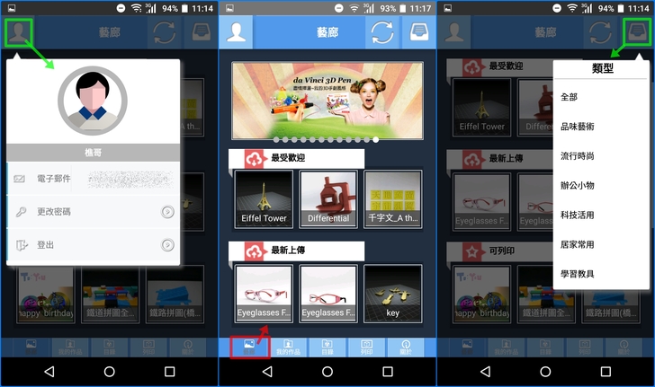 【▼】在XYZgallery App中,主畫面下方有五大功能區塊,依左至右為藝廊、我的作品、目錄、列印與關於。藝廊可依不同類型作排序,其中提供使用者進行登入,是方便後續能保留自己創作的作品,而目錄是指在行動裝置上的內容可透過無線列印來印出。