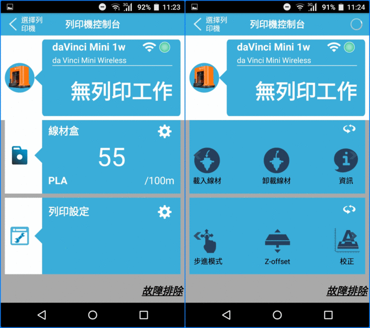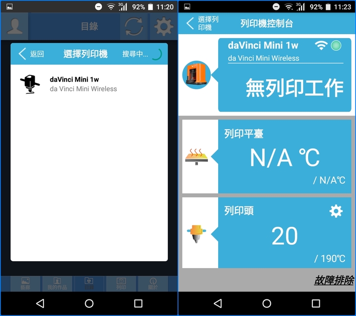 【▼】XYZgallery App也可以進到3D列印機的設定後台,包含目前列印機的狀態、列印平台與列印頭的溫度等資訊。