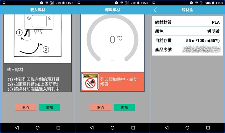 【▼】線材盒的控制,不論載入或卸載線材都會貼心提示標準SOP,線材盒因為有NFC感應晶片,所以也能正確顯示線材材質、顏色、存量與產品序號等。