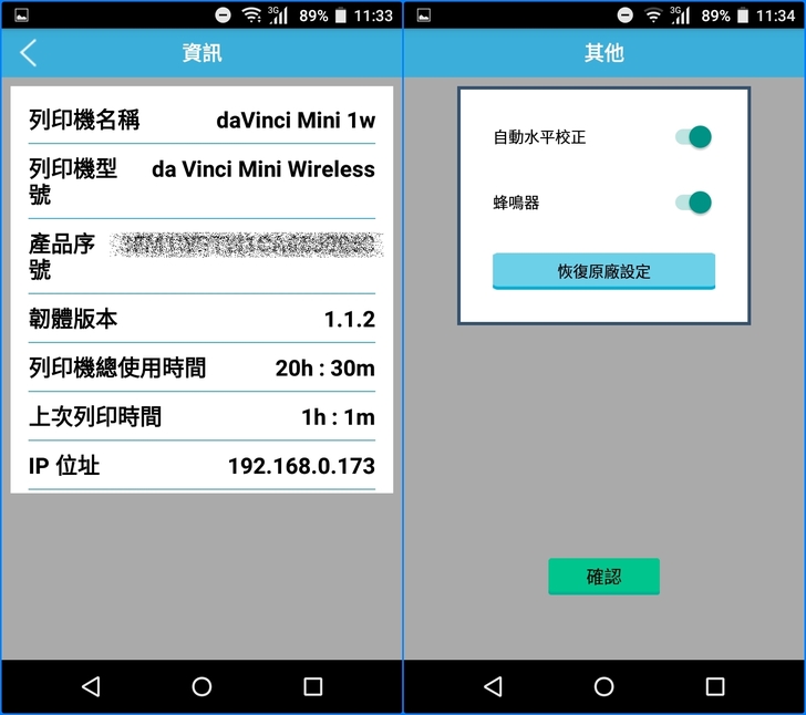 【▼】校正若不滿意,都可以恢復原廠設定,最後是da Vinci Mini Wireless的硬體資訊,包含產品序號、韌體版本、使用時間與列印時間,由於是無線Wi-Fi連接,所以也會顯示目前IP位址。