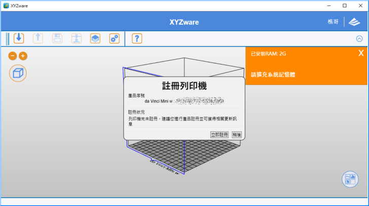 【▼】XYZware基本操作最好使用4GB以上的記憶體與中高等級的顯卡,像小編裝在2GB的小筆電上,就會跳出請擴充系統記憶體的資訊,註冊列印機時會自動抓取da Vinci Mini的產品序號,立即註冊享受原廠更貼心的服務。