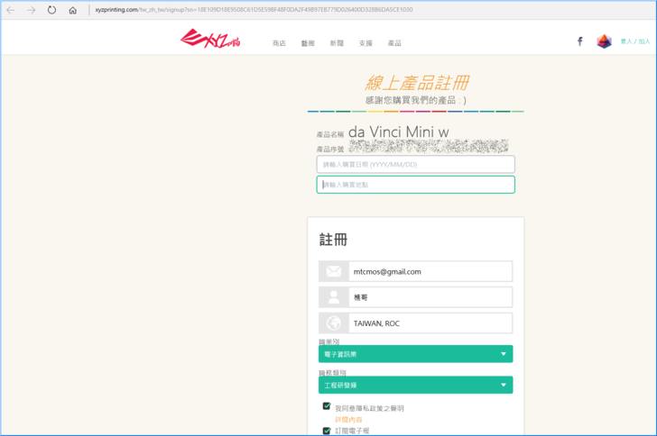 【▼】按下立即註冊之後,會連上XYZprinting的官方網站進行線上註冊,保固日期也會從這一天開始算起。
