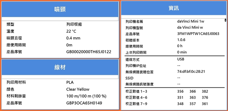 【▼】三大功能都有其相關的資訊,列印模組有噴頭資訊、線材則有線材的材料、顏色與剩餘量等,列印設定則有3D列印機的韌體資訊等。
