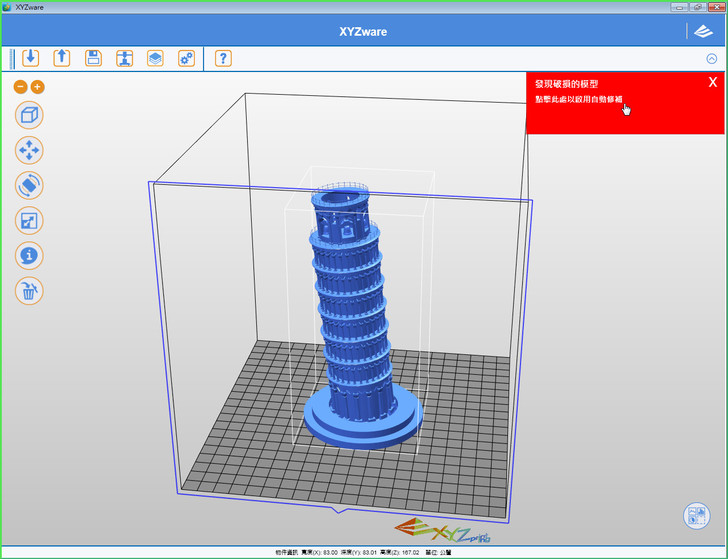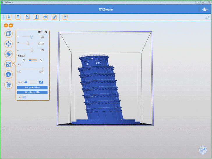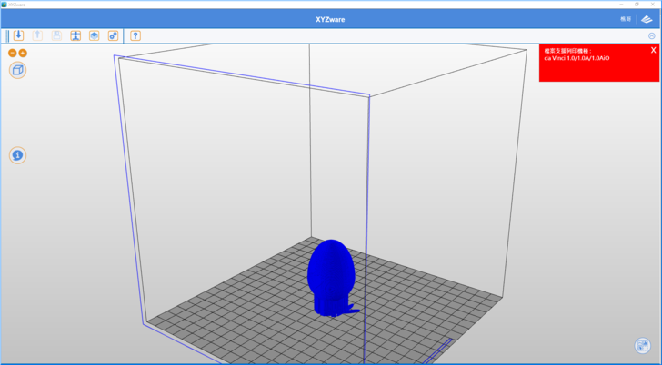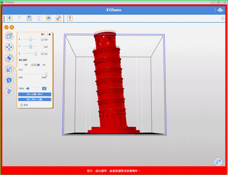 【▼】當列印作品太大時,XYZware會出現紅色框框,代表已經超過列印的大小,所以這時就要進行XYZware的縮放,一方面也可以比較節省耗材。