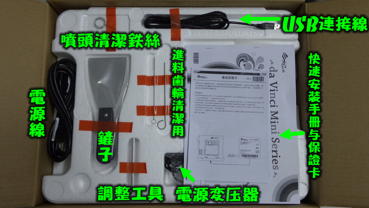 【▼】da Vinci Mini包裝箱內分作上下兩層,上層使用保麗龍將配件一一固定,下層就是da Vinci Mini主機的部分。配件部分有電源線(含變壓器)、USB連接線、調整工具、鏟子、噴頭清潔鐵絲、進料齒輪清潔工具、快速安裝手冊與保證卡,保證卡下方還有1.75mm直徑的 PLA 線材與平台貼布。