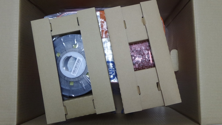 【▼】在保麗龍配件盤下方還有兩個主要的配件,也都有瓦楞紙完整包覆,左邊的就是附屬的PLA線材,右邊則為da Vinci Mini的核心零件-噴頭!