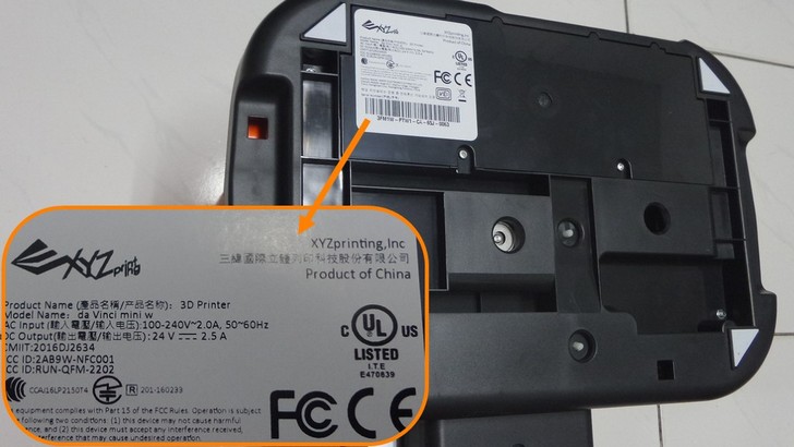 【▼】da Vinci Mini底部有產品資訊,四個角落提供有防滑膠墊來加強列印的穩固性。
