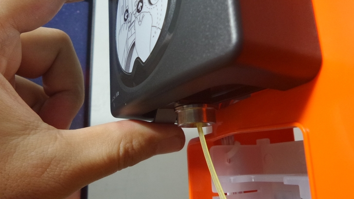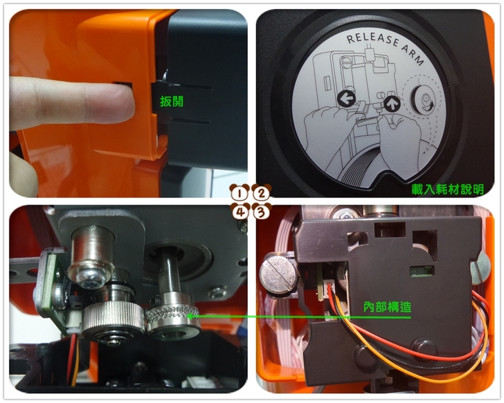 【▼】da Vinci Mini左側為進料齒輪區,殼上有簡單的安裝說明,建議安裝線材時可以將其外殼取下,讓齒輪卡住線材後,轉動載入至進料管中。