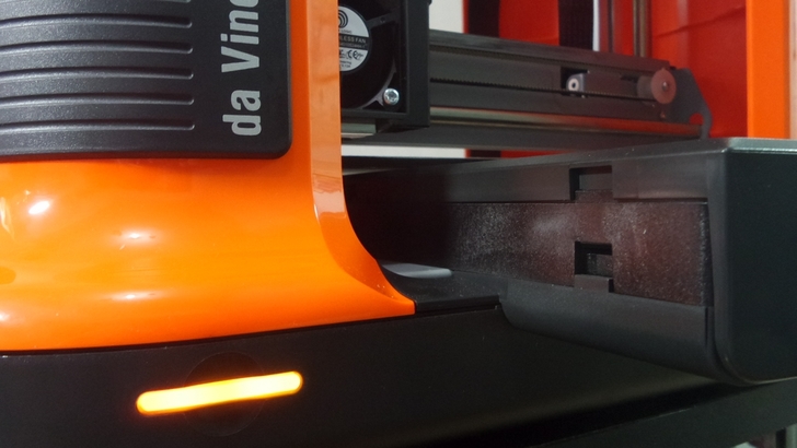 【▼】主機前方左下角印有da Vinci Mini的黑色外殼,其實也是可以開啟的,主要在進行X軸的調校時,方便手工具伸入。