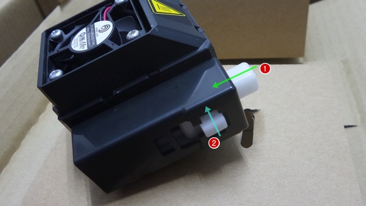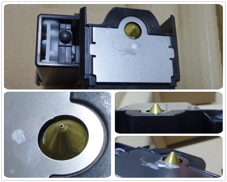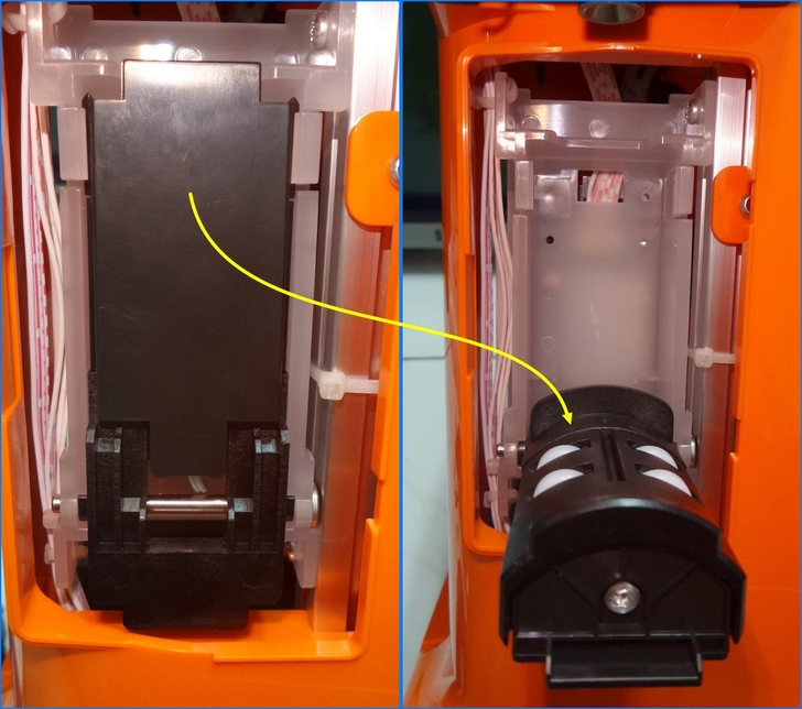 【▼】主機內噴頭安裝處,在安裝噴頭時,可直接將噴頭對準定位點向內壓入即可,而將噴頭取下時,記得要將頂部的快拆按鈕稍微向前扳,這樣才能順利取下,安裝過程中,都要小心注意高溫的金屬噴頭。