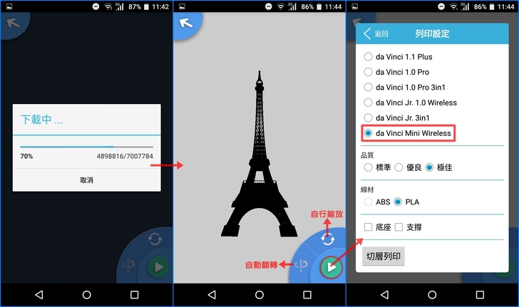 【▼】下載後會自動開啟檔案,用手指就能將巴黎鐵塔任意縮放或旋轉視角,若確認無誤後就可以點選列印設定,記得要選對列印機的型號 da Vinci Mini Wireless,至於列印品質、是否加底座獲支撐都可以自行選擇,唯有線材只能選PLA,之後就可按切層來計算囉~