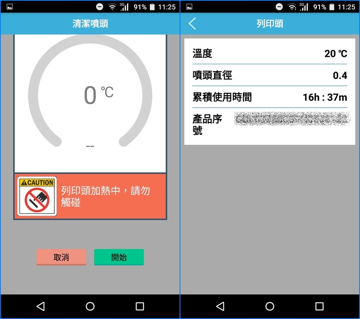 【▼】列印頭的相關資訊有目前溫度、直徑、累積使用時間與產品序號等,若要清潔噴頭按下開始就會立即升溫!