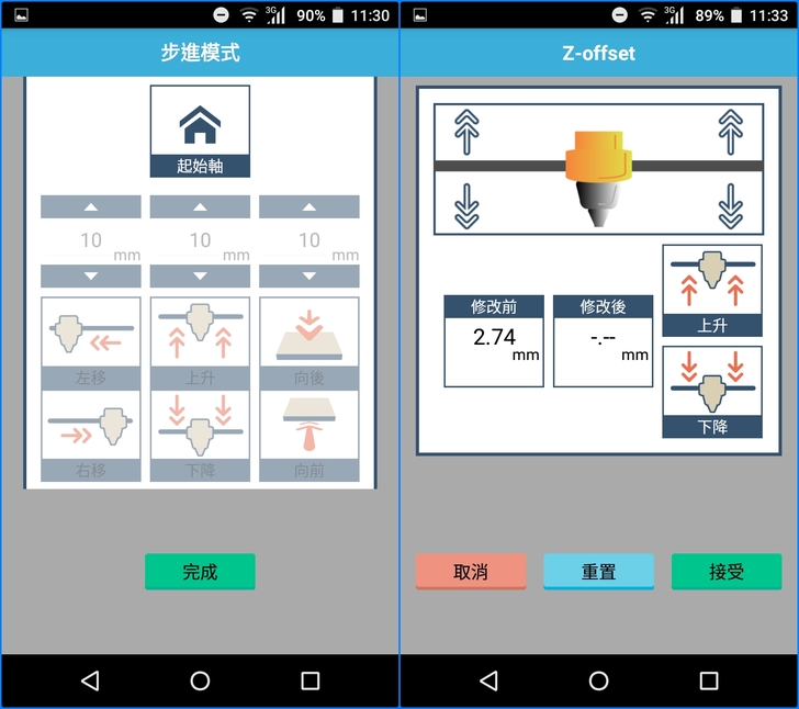 【▼】列印設定->Z-offset,記得配合調整工具來使用。而步進模式就是按一下才會動一下,算是比較進階的微調時使用。