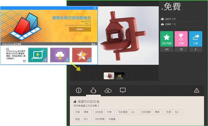 【▼】在進入XYZware時,會跳出數位雲端的訊息精靈,點擊後就會連到官方藝廊,藝廊中的作品大都為免費,下方還有建議的列印設定值,讓初學者不至於列印失敗而卻步。