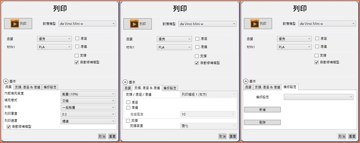 【▼】而在產品的列印選項方面,可以針對品質、支撐、底座、底邊進行調整,更可以新增自已愛好的列印設定,之後直接載入可。