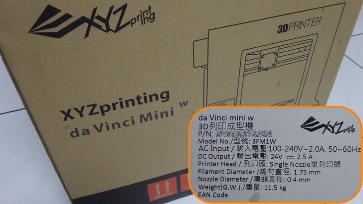 【▼】da Vinci Mini包裝紙箱還蠻大的,長寬高為51cm x 40cm x 48 cm,重量為11.5Kg,一般機車運載是有危險的,若有意購買的朋友,最好有汽車,不然可以試試看資訊月XYZprinting有沒有免運費的服務囉~包裝紙箱上有da Vinci Mini產品型號、序號、輸出入電源、線材與噴頭直徑等資訊。