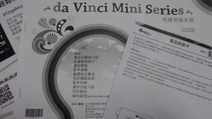 【▼】da Vinci Mini貼心的準備了快速安裝手冊,不過小編覺得XYZprinting自製的教學影片更棒,一步步讓初學者從組裝到設定一次學會。此外XYZprinting不愧是國際大廠,產品正常合理使用之範圍內發生故障時,都可出示此產品保固卡,三緯國際將免費提供保固服務。包含了有