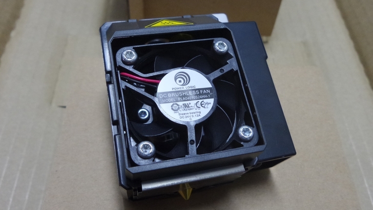 【▼】噴頭上方的散熱風扇是採用新能量科技的PLA04010S24HH-1,額定電源為DC24V@0.12A,小小不起眼的風扇,風力還蠻強的,能將熔解PLA線材的味道快速飄散。