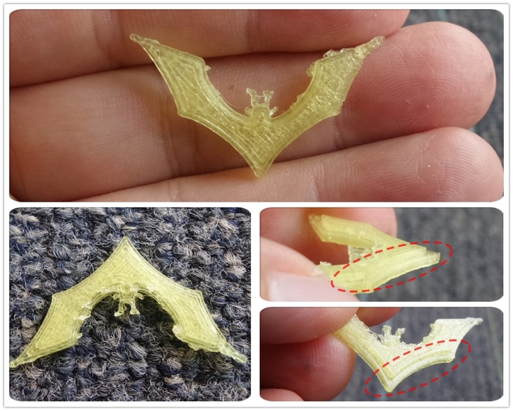 【▼】雖然印太小的3D作品會有潰散的機率,不過0.4mm的噴嘴印平面還算OK,以等比例縮小的蝙蝠鏢來看,紅色虛線的兩層間距有明顯印出,也不輸市面上其他列印機種。