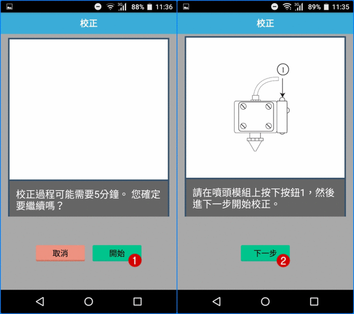 【▼】由於是第一次使用,所以會先進行噴頭的校正動作,校正時間大約五分鐘,是確保列印成功與否的關鍵,所以建議常常將3D列印機搬動到不同處的玩家,都一定還要重新再校正一次。