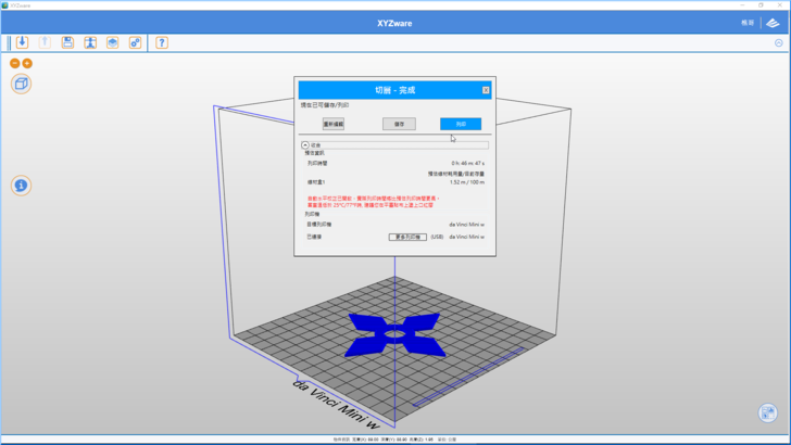 【▼】切層過程中會根據模型大小、網格複雜程度與手機性能有不同的分析時間,最後會顯示目前da Vinci Mini Wireless的列印資訊。