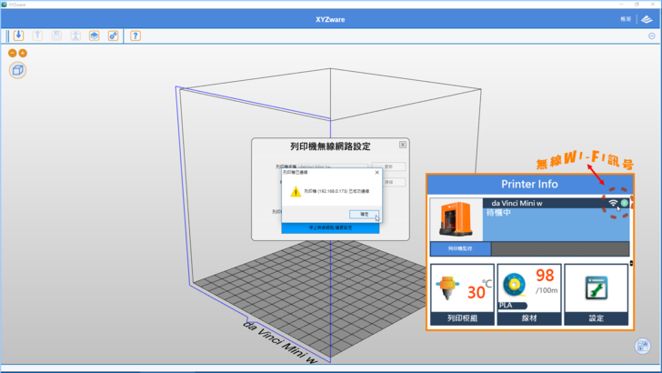 【▼】在無線網路設定方面,先利用USB 連接線確實將電腦與列印機連結,完成後再開啟「XYZware」,點擊畫面右下角「列印機監控」功能圖示,開啟操作功能。點選列印機監控功能圖示,開啟Wi-Fi連線設定,點擊「無線網路設定」> 進入設定畫面。
