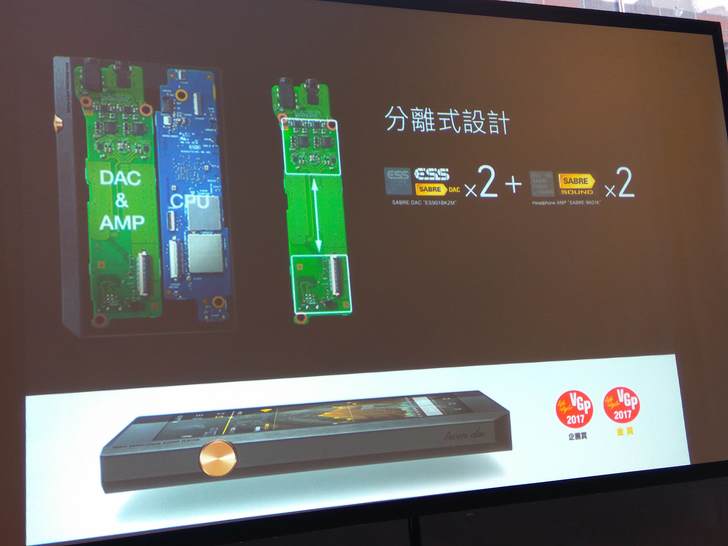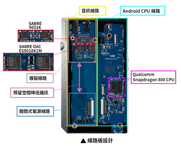 ▲雖然像手機,但內容卻完全不一樣,為了聲音的獨立,所以採用了分離式的機板,但介面操作與音樂播放獨立,才不會互相干擾。而ESS Technology ES9018K2M DAC、SABRE 9601K耳擴晶片則各用了2組,讓音樂可以更完整的被解析。