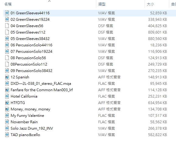▲曲目準備包括各種不同規格的檔案,除了流行樂外,也包括古典、多樂器等來實機聆聽。